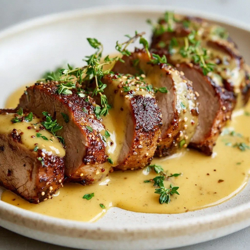 - Plate and Garnish: Slice the pork into medallions and arrange them on a warmed plate. Spoon the mustard cream sauce over the slices, drizzle a little extra butter if desired, and scatter fresh parsley and thyme sprigs for a pop of color. Serve immediately with your choice of sides.